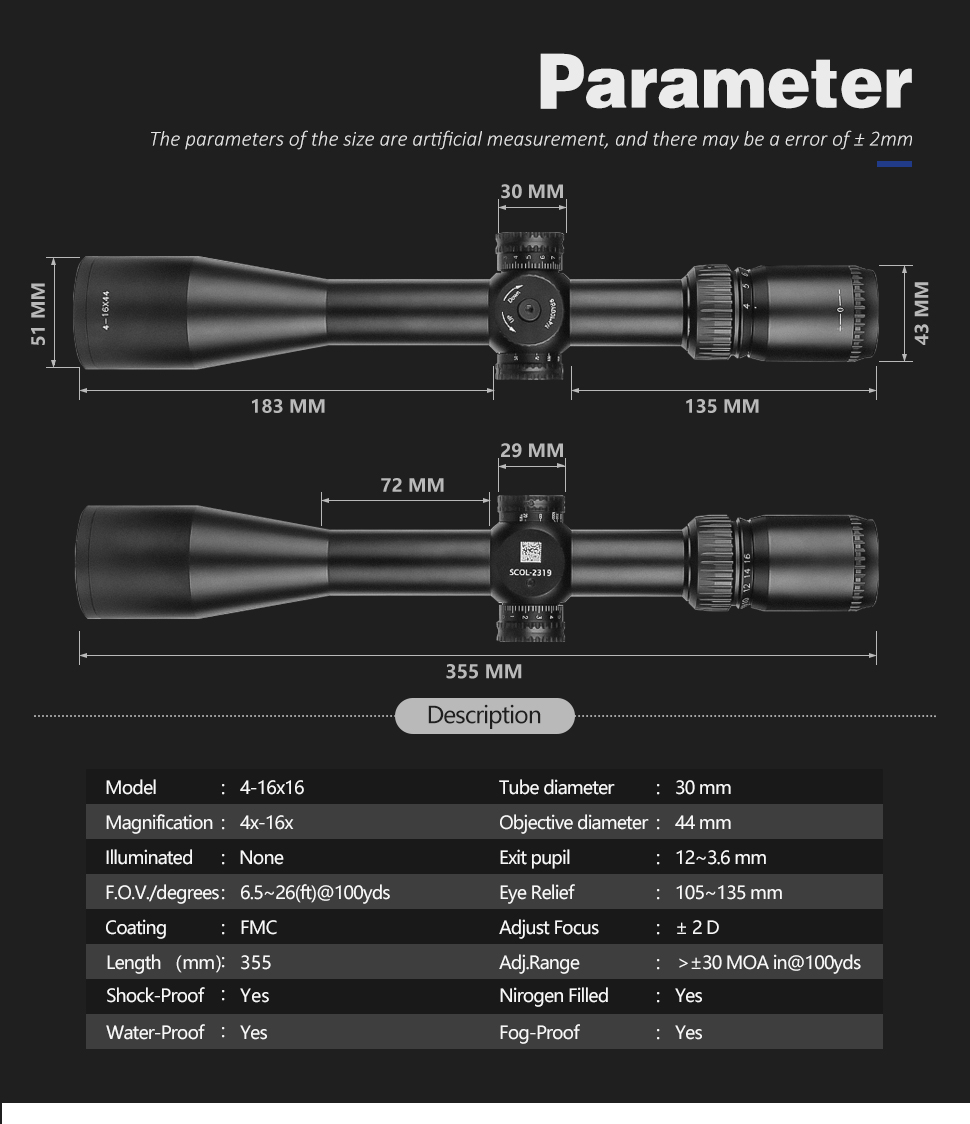 [해외] 16배율 4-16x44 SFP 라이플 스코프 SPINA SP-41644-SFP